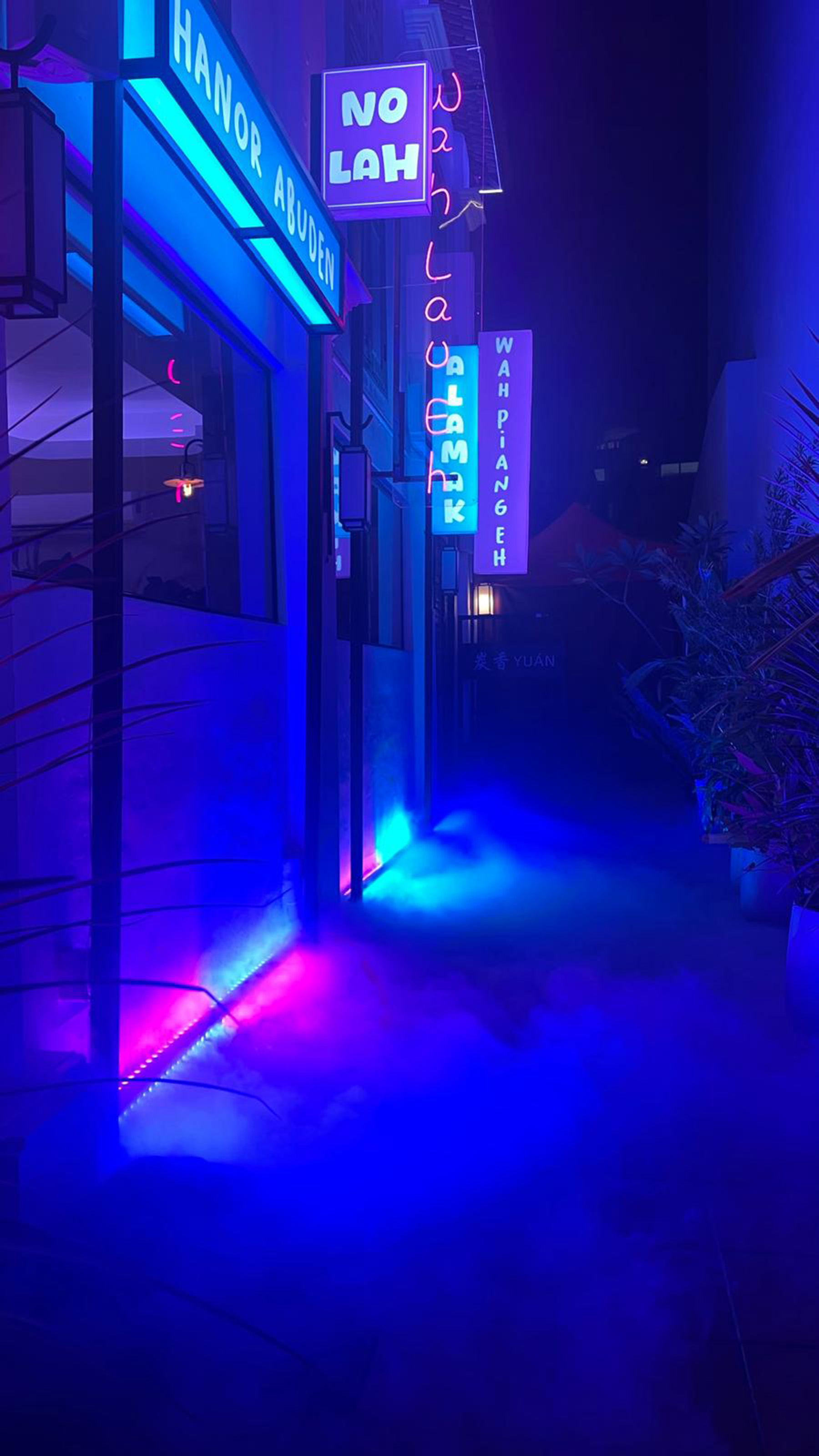 The purple-blue alleyway is lined with flashy signboards shouting colloquial Singaporean sayings like ‘wa lao eh’.