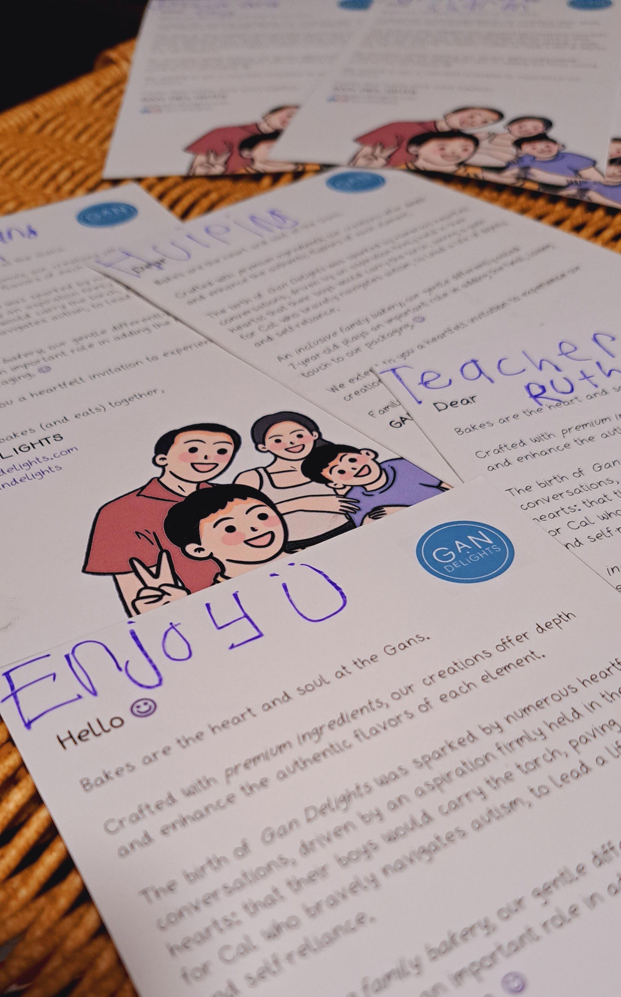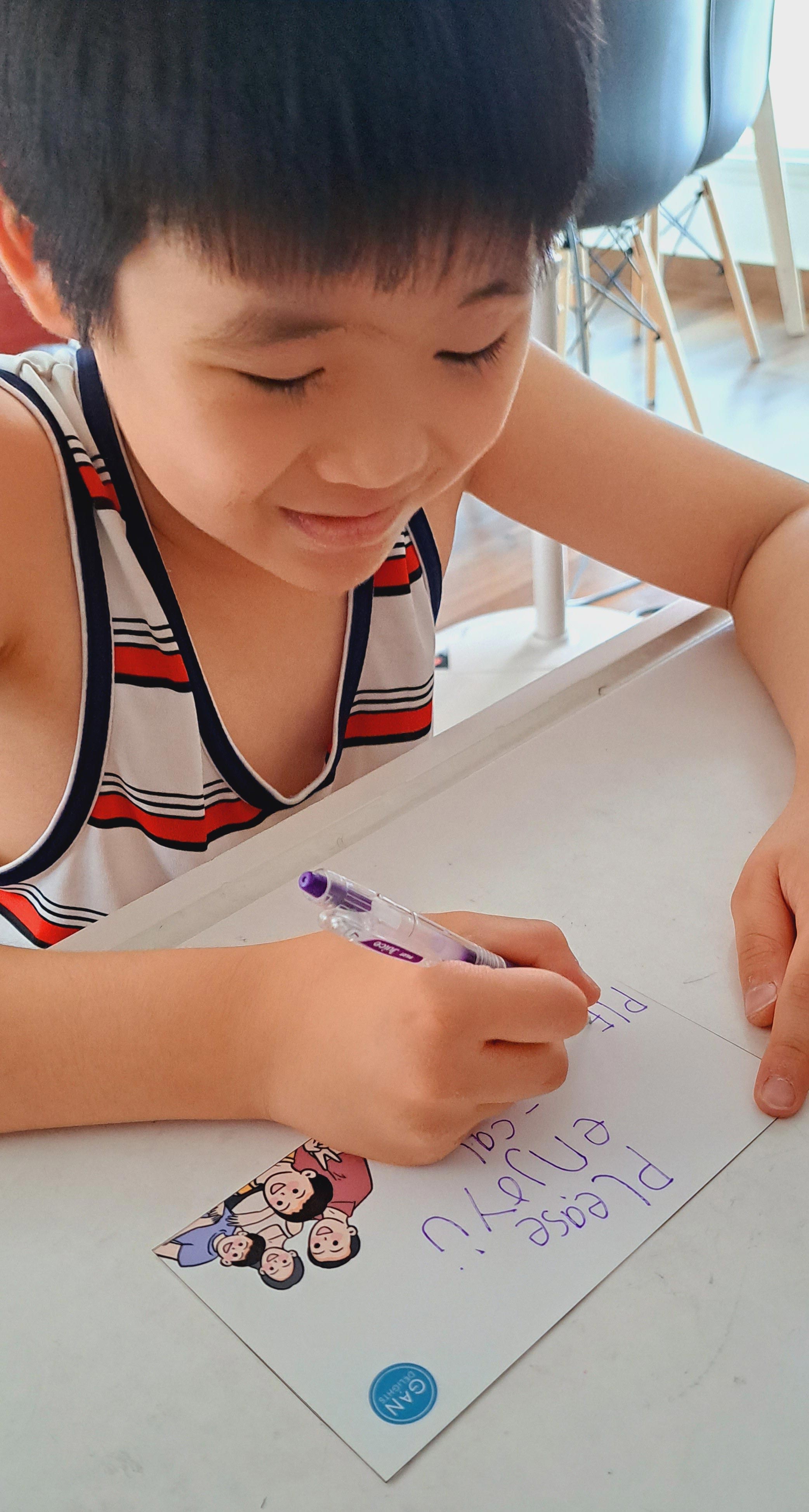 It is especially crucial for Cal to help with the card-writing, as it improves his cognitive development. “Although [Cal] is verbal, he lacks the confidence to speak. He helps to write out customers’ names, so with every new name, we’ll teach him how to pronounce and write it,” Rachel explains. She takes turns with Ming to assist their son with his writing.