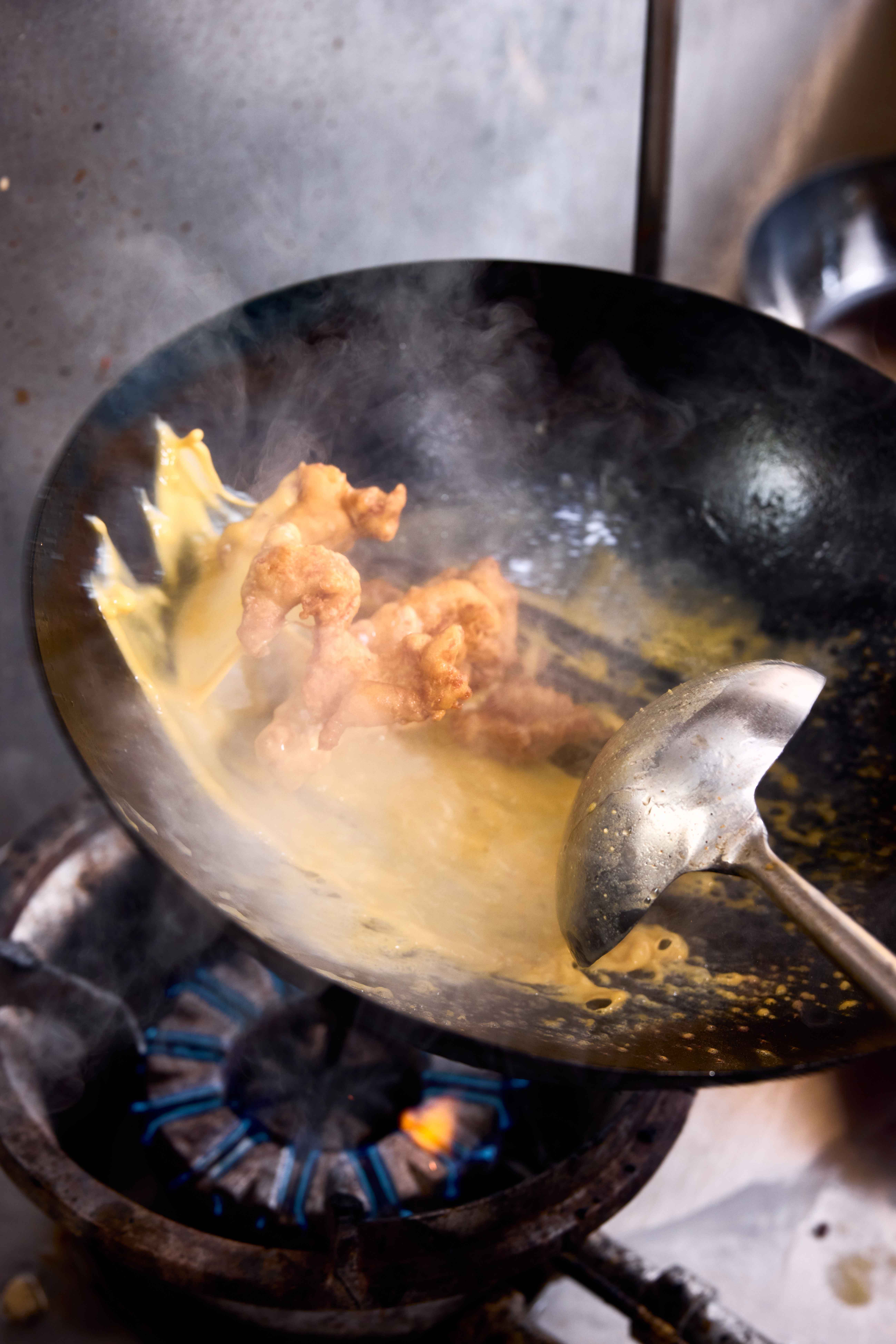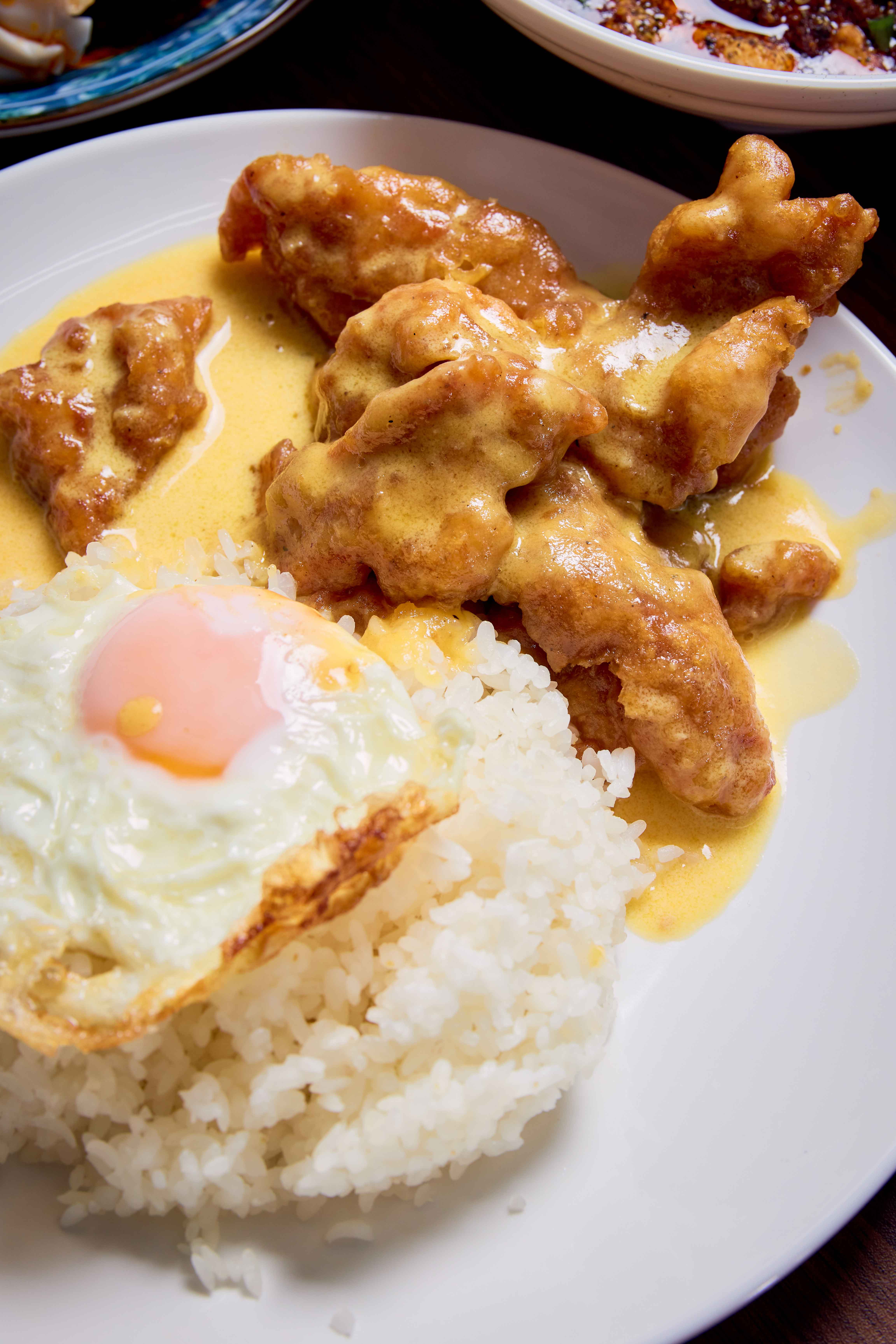 Featuring meaty chunks of fried pork chop doused in a creamy salted egg yolk sauce and topped with a runny-yolked fried egg with crispy edges, this dish tastes just like the one served at New Station Snack Bar (Chloe confirms it’s cooked with the same recipe).