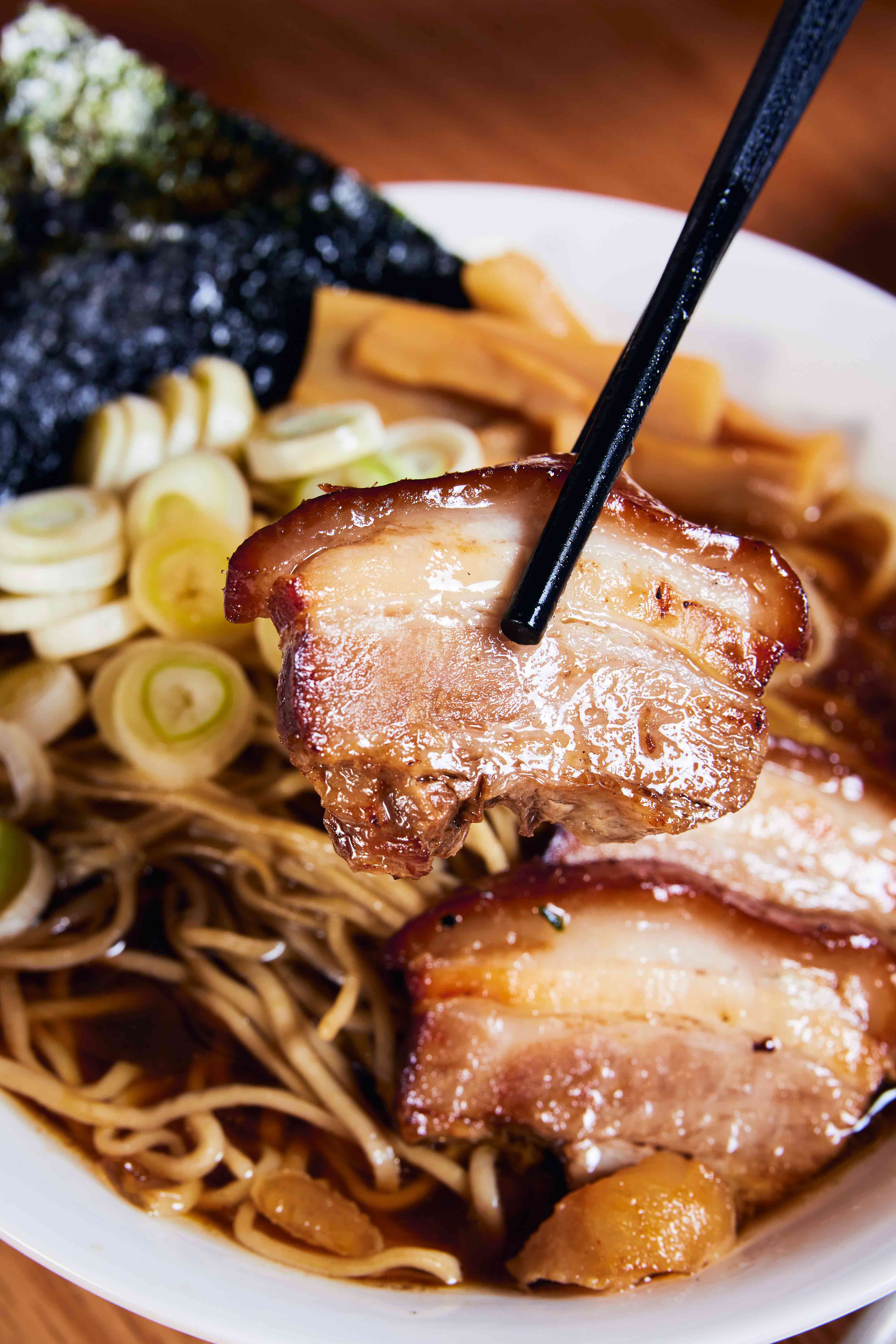 Featuring the same soup and toppings as the above, but with three decadently thick and juicy slices of soy-braised pork belly instead of duck. While this was good at our tasting, our colleague who had it on another occasion found it made the ramen broth too sweet and overwhelmed the smoky notes of the bonito. The silkier, smokier duck is a superior option.