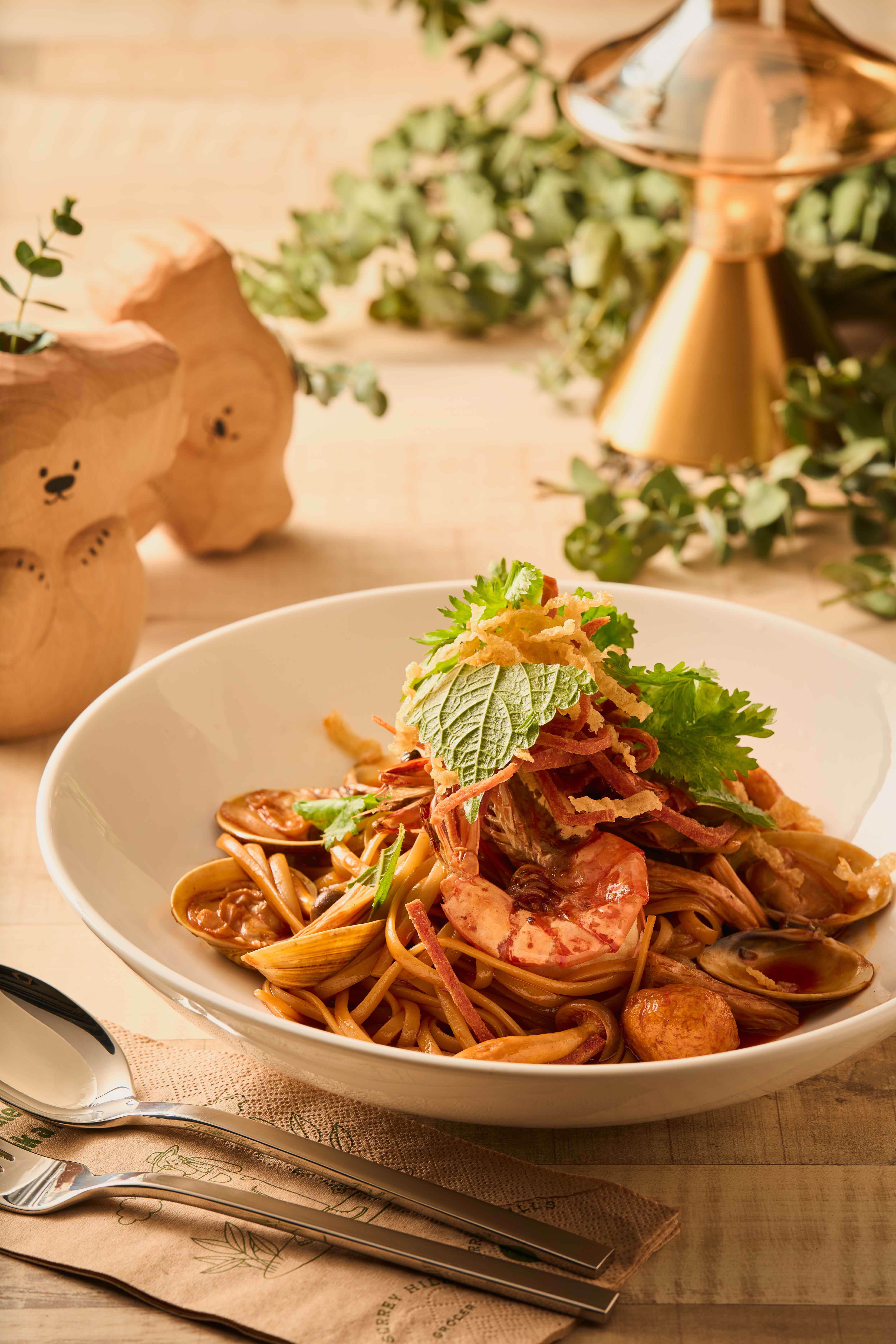 Spice fiends will be pleased with this al dente pasta tossed in mala sauce and garnished with tiger prawns, deep-fried luncheon meat, quail egg, crispy beancurd puffs and skin.