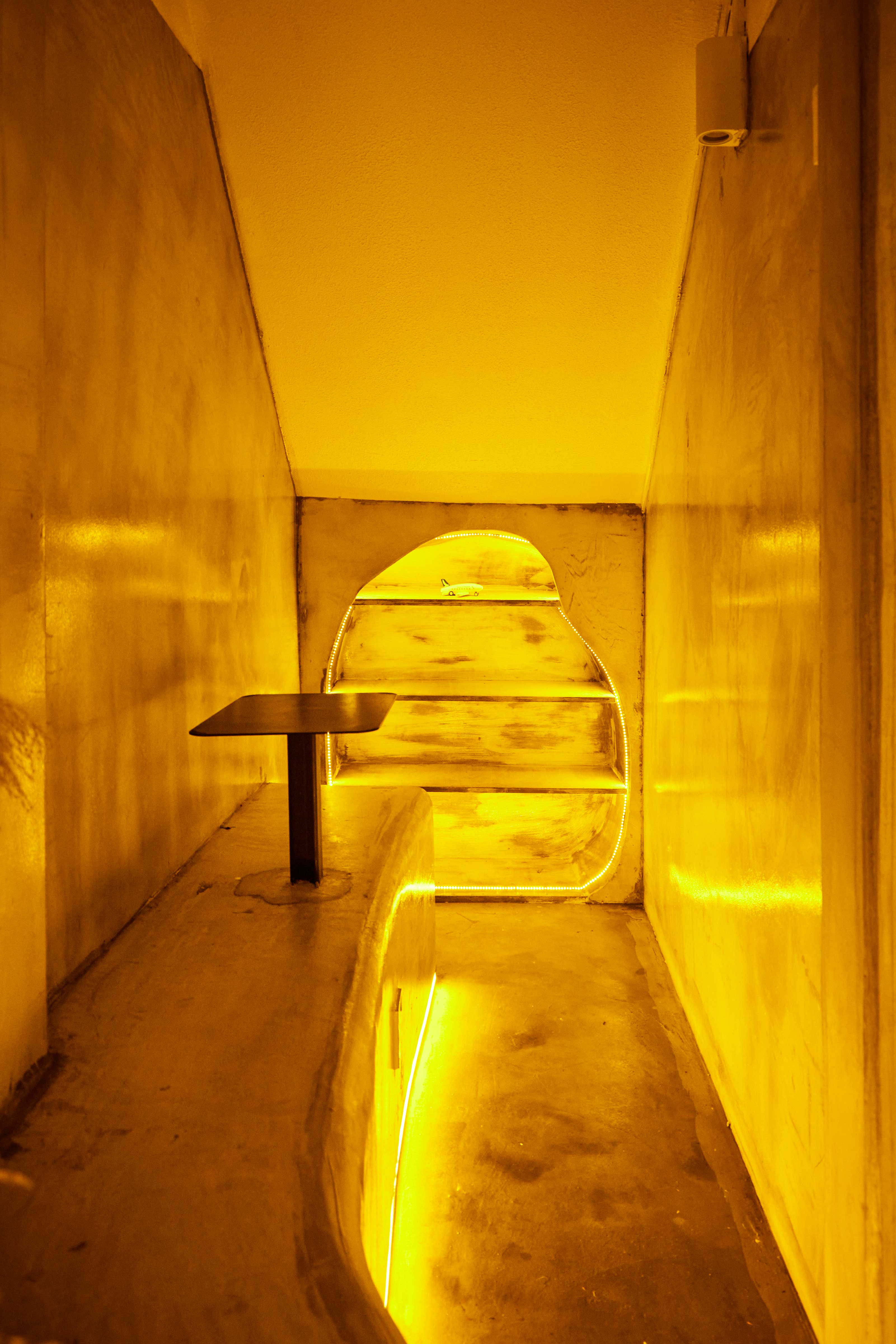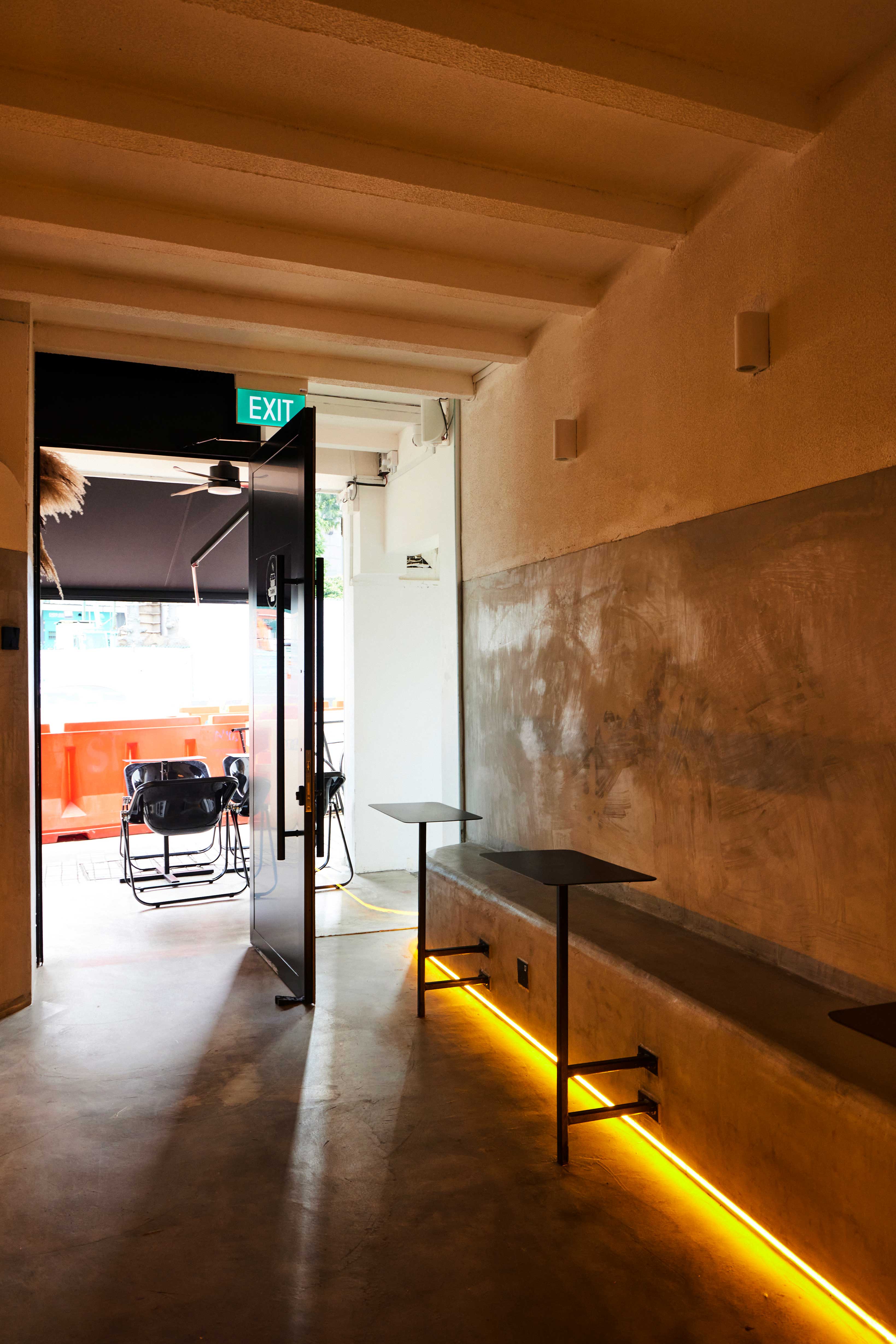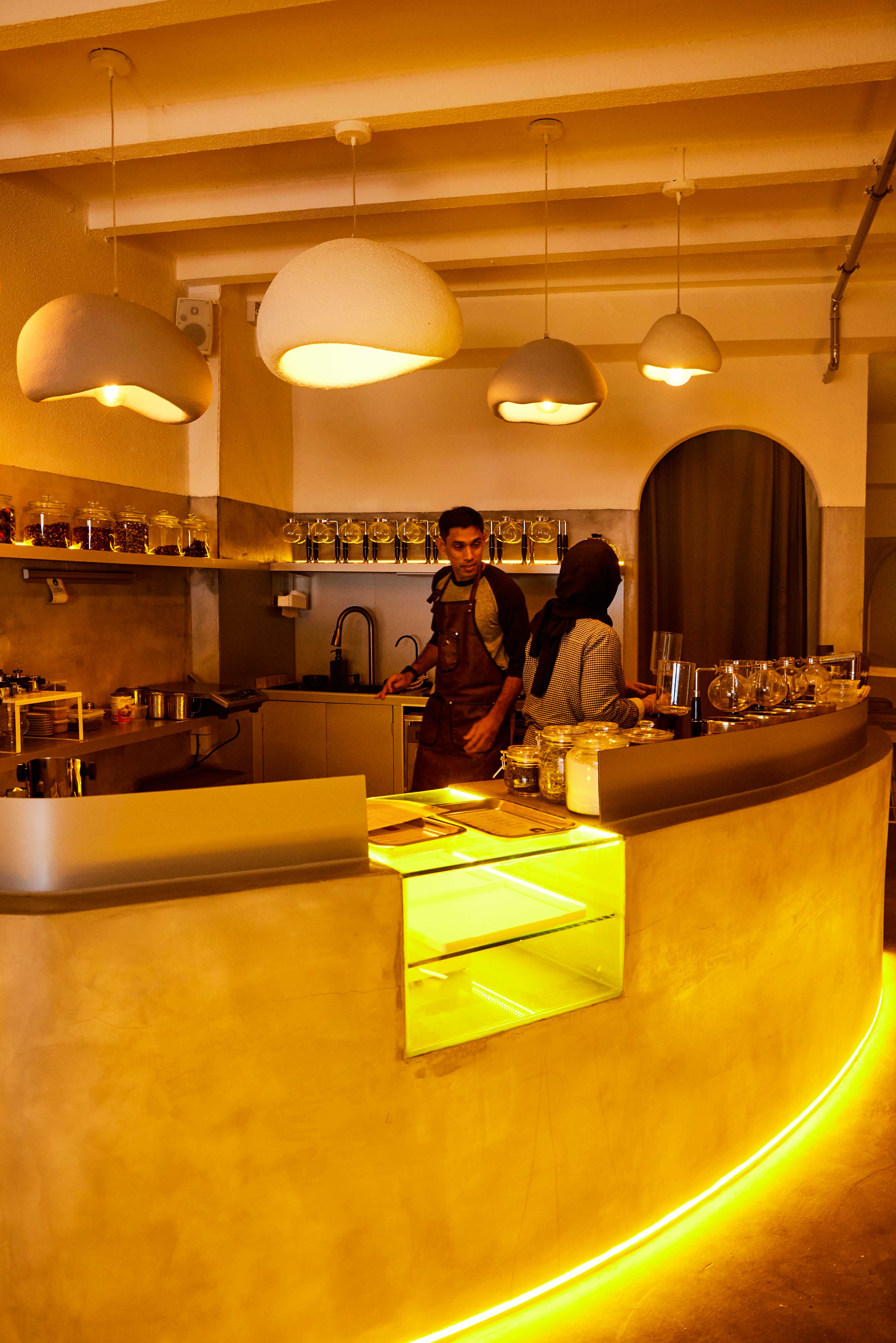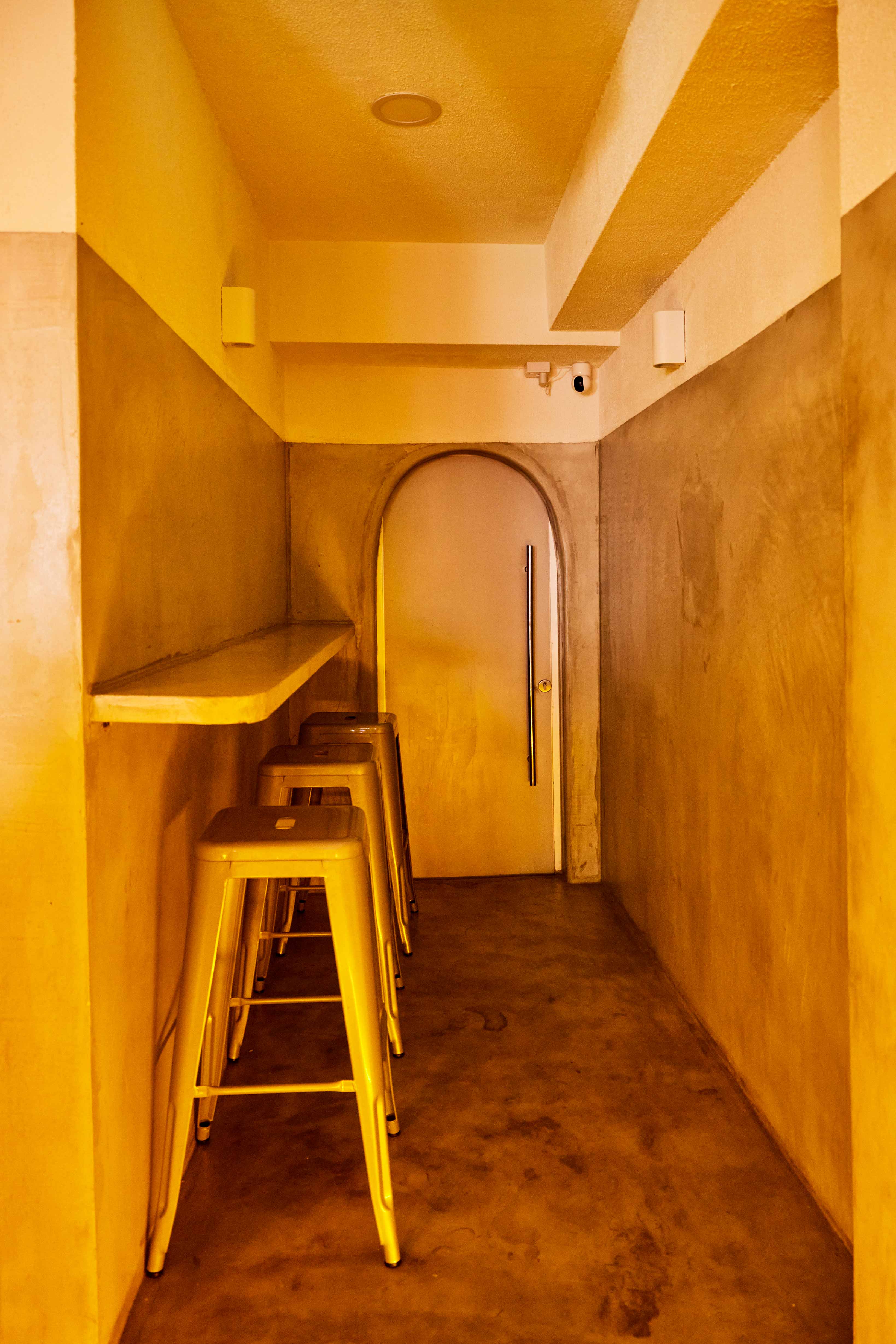 Sporting grey cement walls, built-in benches and flooring as well as futuristic accents like neon yellow lights and eggshell pendant lamps, the minimally decorated cafe’s sleek, industrial vibe is starkly different from Tarik’s rustic, vintage-inspired decor.