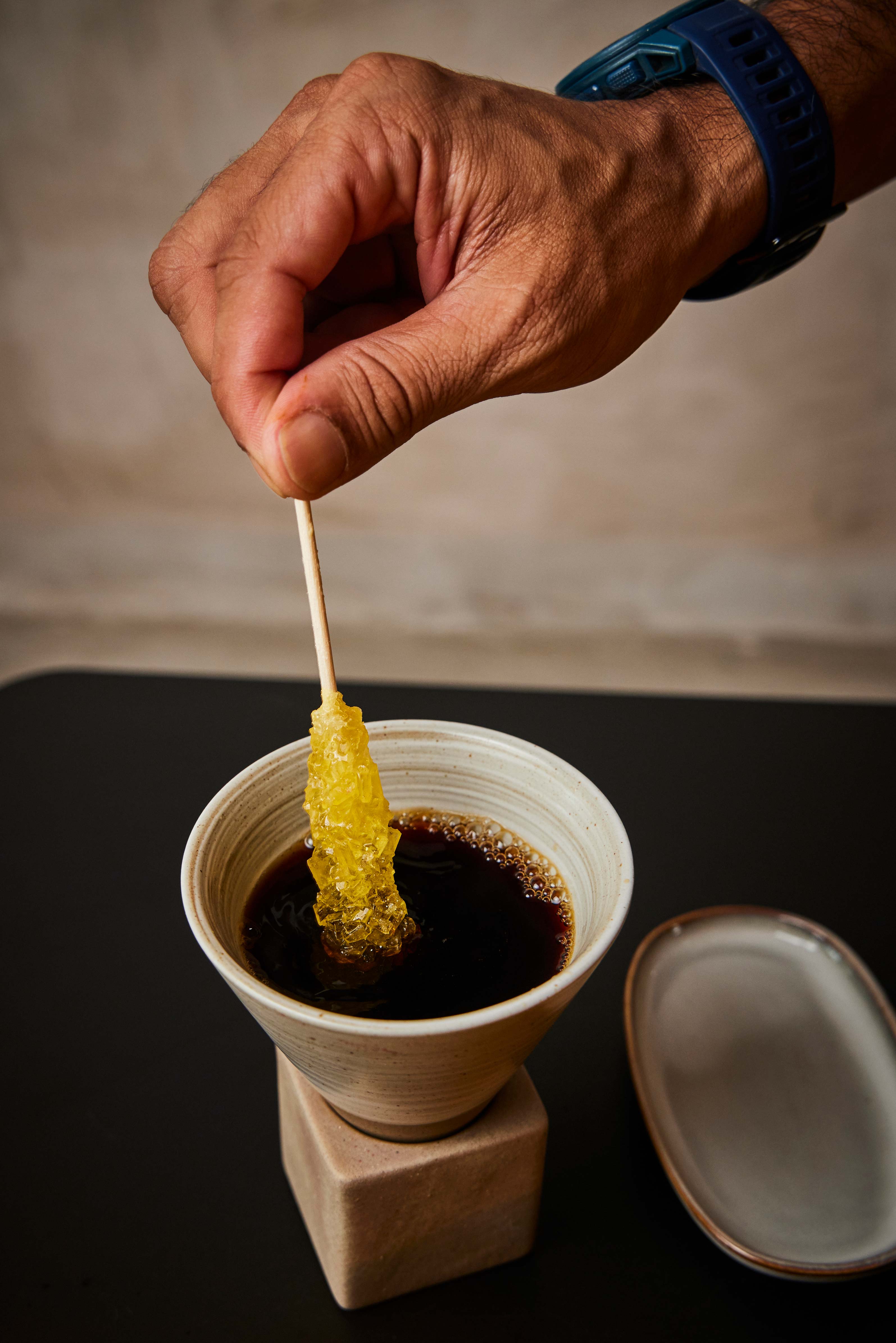 The order comes with an Iranian saffron-scented rock sugar stick – stir it into the coffee to adjust its sweetness.