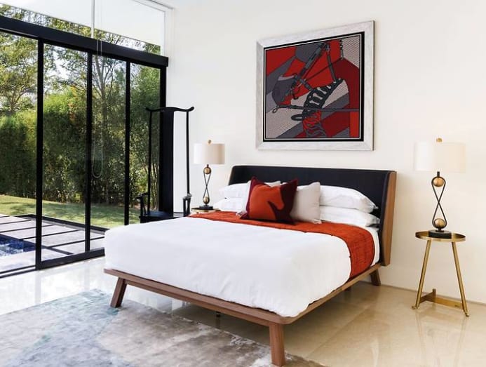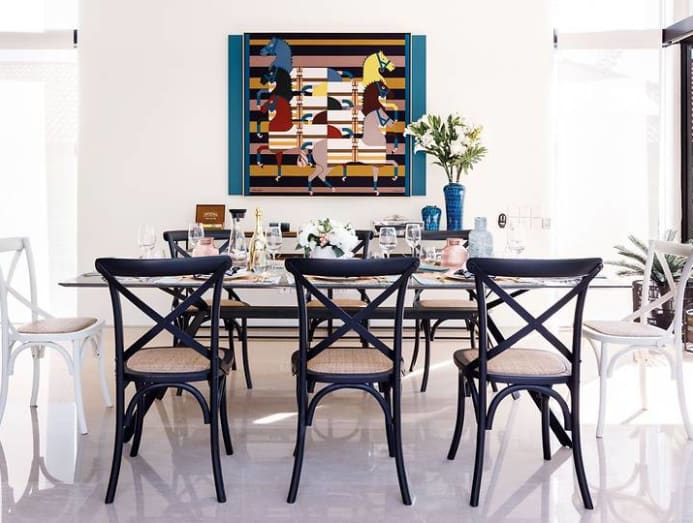 The dining room’s centrepiece is another Hermes scarf that plays up the equestrian theme of this area. The Alivar Cut marble-top dining table, black-and-white dining chairs and white barstools were selected to reflect elements of the horse harness and saddle. Also located on the ground floor is the guest room, which opens out onto the pool. A black Chinese-style armchair gives the room a touch of personality while complementing the modern look of the space.