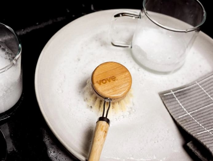 The bristles of this biodegradable bamboo dish brush are made from the agave plant and can resist high temperatures while retaining its shape. They absorb water more easily to better clean tough dirt and stains, while still being gentle on surfaces. It’s also a useful tool for cleaning stove tops, sinks or the bathroom. Each set features two replacement brush heads.