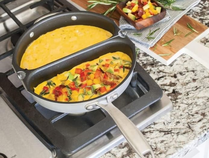 Inspired but daunted by the thought of folding an omelette as seen in celebrity French chef Jacques Pépin’s videos? This non-stick pan does the work for you, allowing you to create fluffy omelettes or frittatas in just minutes. Simply pour in beaten eggs and your favourite ingredients, then fold the pan over. The pan can also be used to cook sausages, bacon and vegetables separately.
