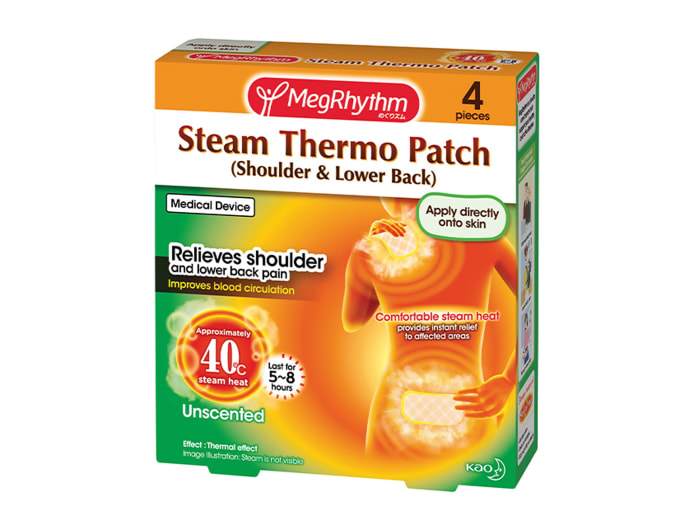 Whether you’re hard at work at the desk, bent over doing housework, or carrying your child, the lightweight MegRhythm Steam Thermo Patch Shoulder & Lower Back stays on, releasing a soothing warmth to nurse aches from five to eight hours.