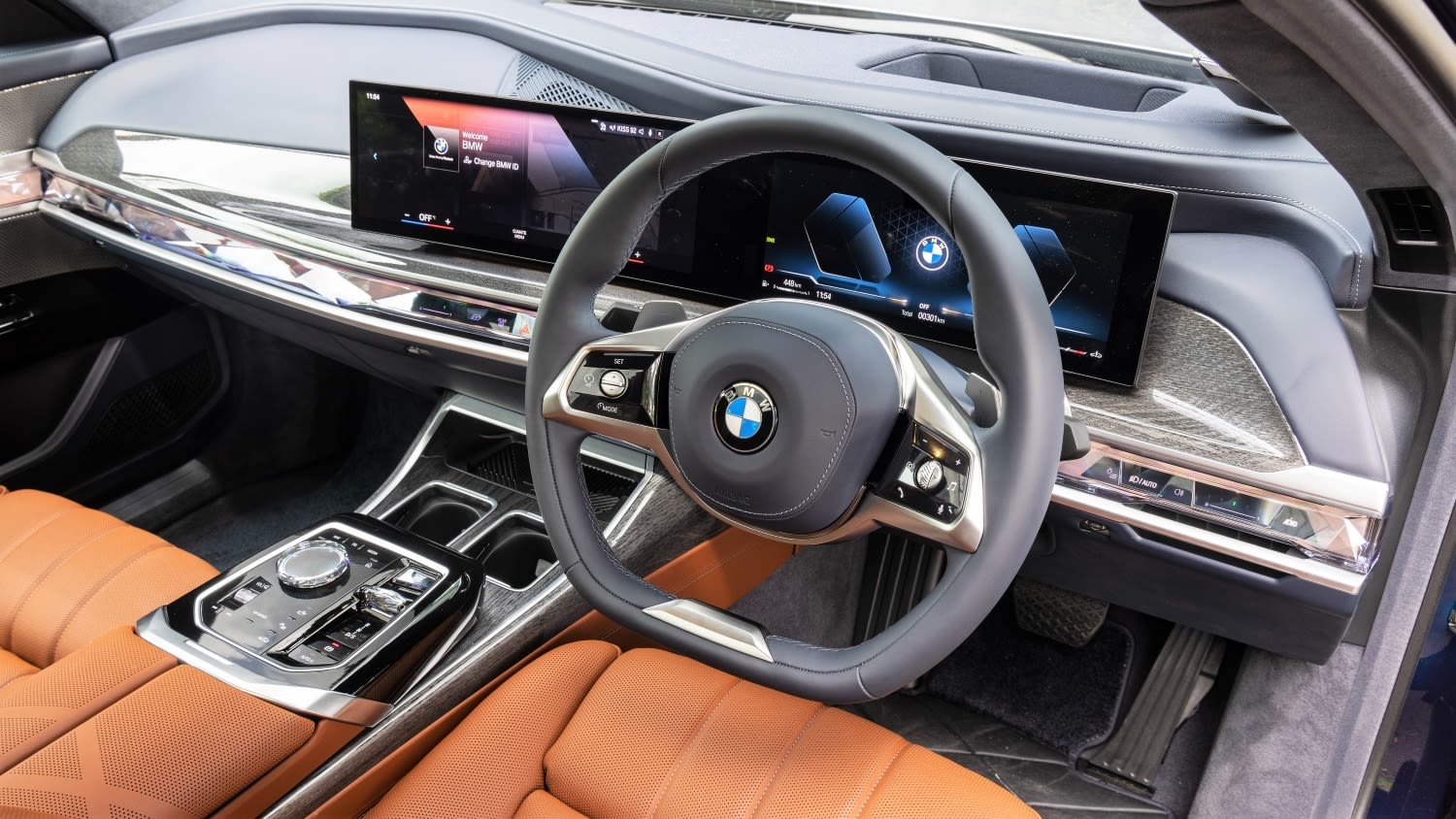 Greeting the driver is the BMW Curved Display, a fully digital screen grouping that pairs a 12.3-inch information display behind the steering wheel with a 14.9-inch control display.