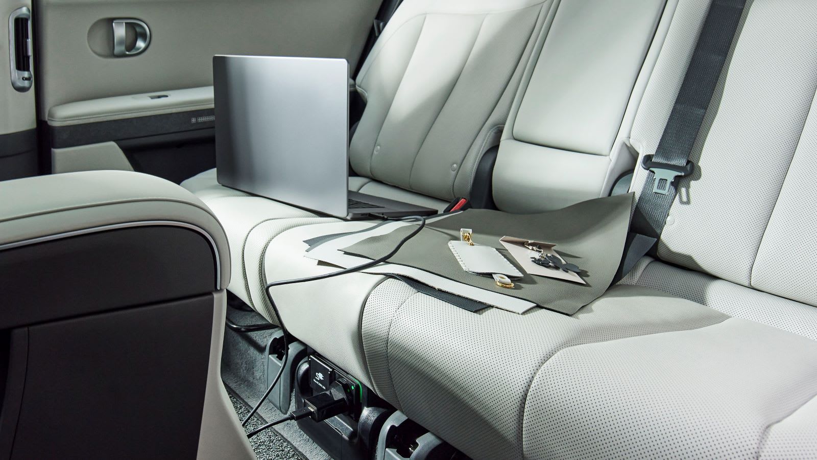 Like many pure electric vehicles, the Hyundai IONIQ 5 maximises cabin space thanks to its compact drive components. The car’s movable centre console offers ample storage space and can slide forward and backward along its flat floor. This provides easy access for both the driver and front-seat passenger and maximises the flexibility of the car’s spacious cabin.