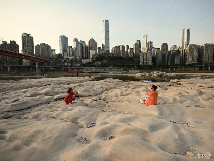 People sit in a shallow pool of water in the bed of the Jialing River, a tributary of the Yangtze, in south-western China's Chongqing municipality on Aug 20, 2022. (Photo: AP/Mark Schiefelbein)
