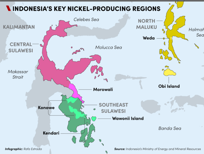 Indonesia’s nickel reserves are mostly in North Maluku, Central Sulawesi and Southeast Sulawesi provinces, which are also the key nickel-producing regions.