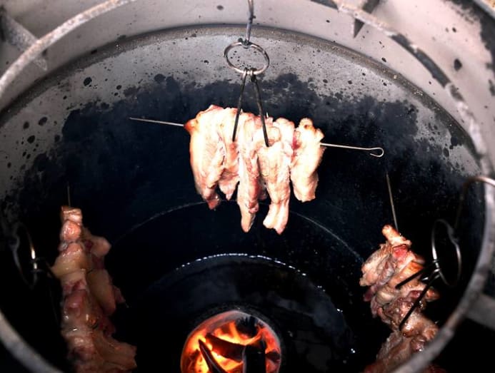 A lot of the condiments are made daily. So is the char siew, which Mr Lee roasts in two large metal ovens over charcoal fire.