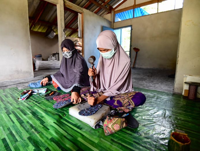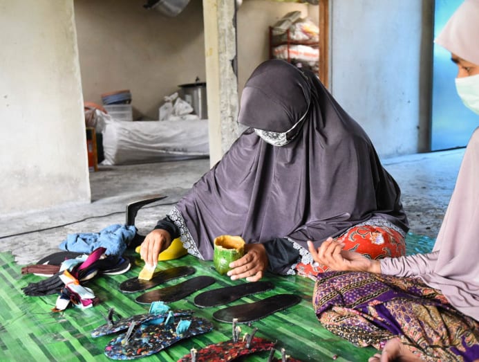 With precision, she punctures holes for shoe straps with a hammer while her friend glues the soles together. For five years now, they have been earning extra income from making flip-flops without having to travel far for work in the city.
