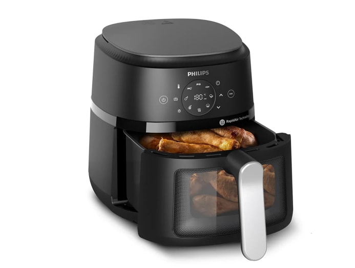 Featuring a handy window, this Philips air fryer offers 13 cooking methods including air frying, baking, grilling and roasting. RapidAir technology offers efficient cooking. Users can manually set time and temperature or use preset functions.