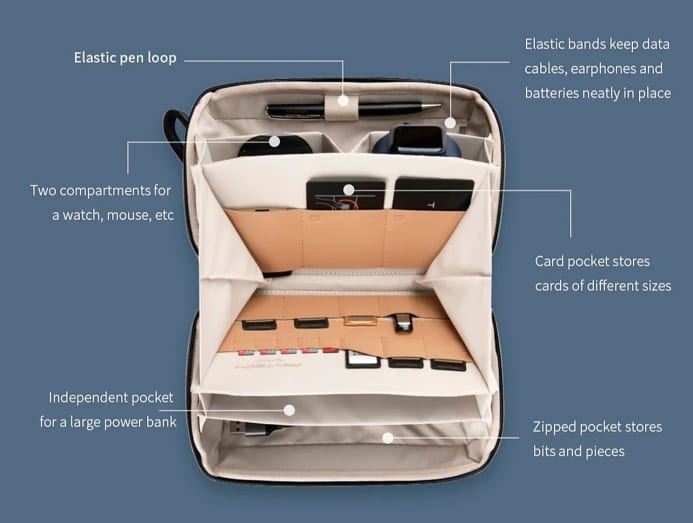 Compartments and internal layout: You’ll probably need a mix of zippered compartments, elastic loops and mesh pockets to keep cables and accessories in place.