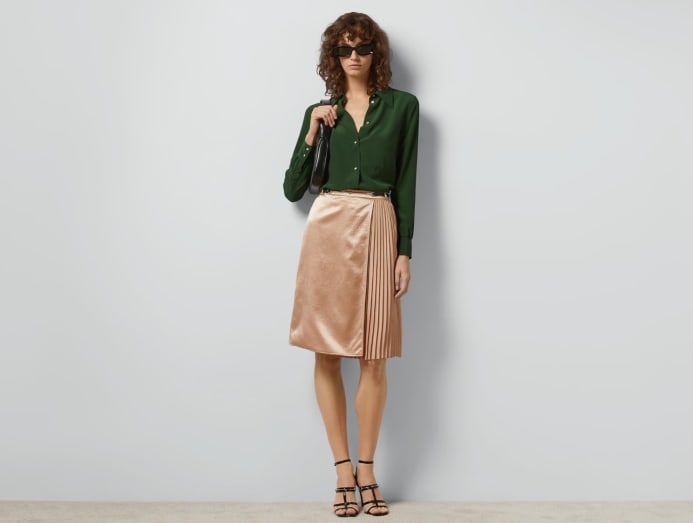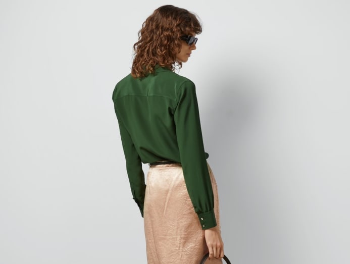A fibre produced by silkworms, silk has long been coveted for its soft texture and sheen. Silk crepe de chine, produced by twisting the yarn, is more wrinkle-resistant and slightly more matte compared to other silks. For best results, dry clean or hand-wash with liquid detergent, as powder detergent might cause bleaching. Iron on the lowest setting over a pressing cloth to avoid direct heat contact.