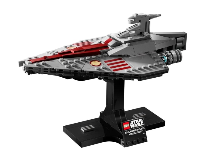 Recreate the drama of the Battle of Geonosis with the Lego’s first model of the Acclamator-Class Assault Ship. This model captures authentic details like engine bay and bridge and includes a stand with a nameplate to display your ship.