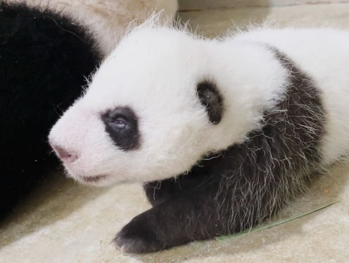 The cub, which was revealed to be a boy at about four weeks’ old, has been growing and developing black-and-white markings. Pandas weigh 200 grams or less at birth and are blind and pink.