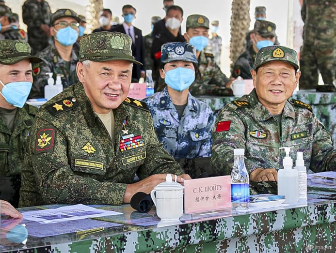 Russian Defense Minister Sergei Shoigu and Chinese Defense Minister Wei Fenghe watch a joint military exercise by Russia and China held in the Ningxia Hui Autonomous Region in northwestern China on Aug 13, 2021. (Savitskiy Vadim/Russian Defense Ministry Press Service via AP, File)