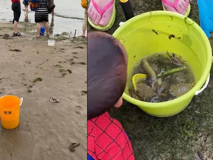 Visitors to Changi Beach were seen picking up sea creatures and collecting them in pails. (Photo: Daphne Ting)