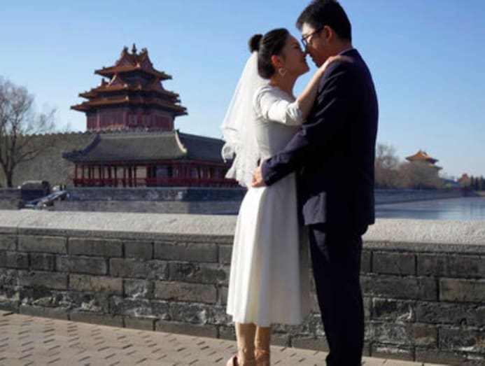 Groom Dong Yangfeng and bride Wang Sai pose for photos near the Forbidden City in Beijing on Sunday, Dec. 20, 2020. (Photo: A/Ng Han Guan)