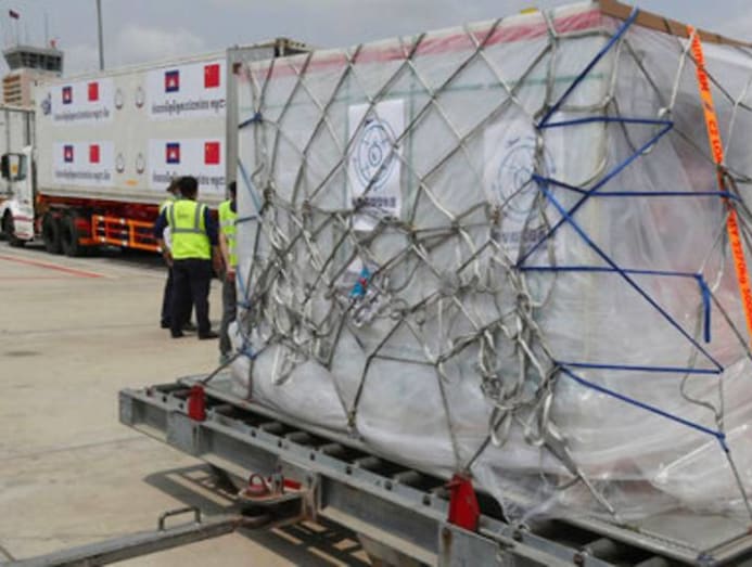 Boxes containing Sinovac's COVID-19 vaccines arrive at Phnom Penh International Airport, in Phnom Penh, Cambodia, Friday on Mar 26, 2021. (Photo: AP/Heng Sinith)