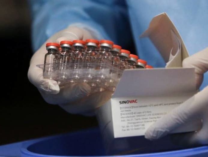 A box with China's SINOVAC vaccines against COVID-19 is seen during the mass vaccination program for the elderly people at Movistar Arena in Bogota, Colombia on Mar 9, 2021. (Photo: REUTERS/Luisa Gonzalez)