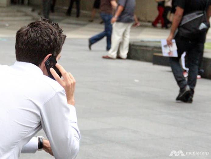 Customers were more satisfied with mobile and broadband services from their telcos in the first quarter of this year, compared to the same period last year. (File photo) File photo of a man using his phone in Singapore's CBD district. (Photo: Francine Lim)