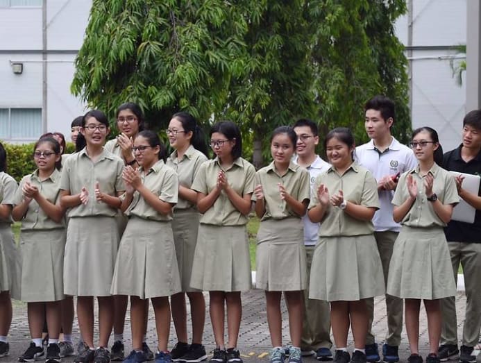 Students lining the driveway at Temasek Junior College. (Photo: Howard Law)