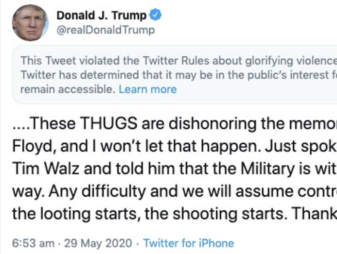 On Friday (May 29), Trump tweeted about protests in Minneapolis against the police killing of a black man, George Floyd: “when the looting starts, the shooting starts”.