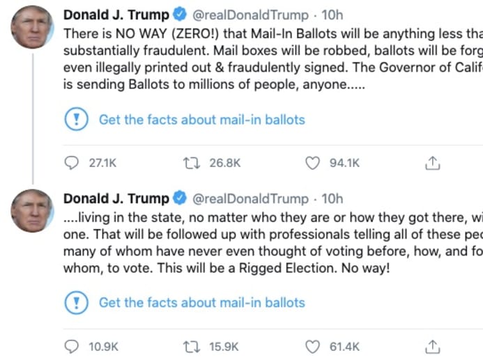 Beneath the tweets, Twitter posted a link — labelled “Get the facts about mail-in ballots” — to a fact-checking page calling Trump’s claims “unsubstantiated”. That linked to media reports on studies showing only an infinitesimally small number of fraudulent mail-in ballots in past elections.