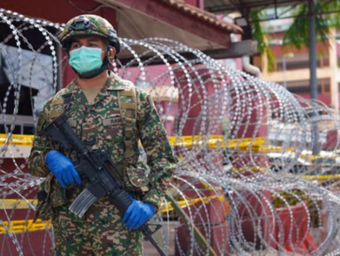 An armed soldier stands guard outside a high density residential area placed under the enhanced movement control order (EMCO) on the outskirts of Kuala Lumpur, Malaysi on Jul 2, 2021. (Photo: AP/Vincent Thian)