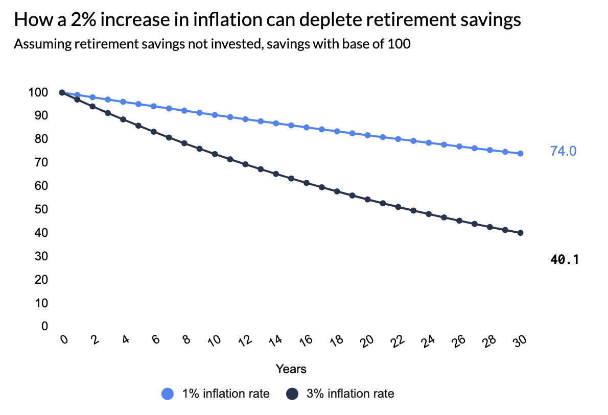 The Government’s concern around retirement adequacy is well-founded, given rapidly rising cost of living pressures. A sustained increase in the long-term trend of inflation from 1 per cent to 3 per cent will lead to an approximately 45.8 per cent decrease in retirement savings over 30 years. A 1 per cent annual inflation rate will reduce purchasing power by 26 per cent over 30 years, while a 3 per cent inflation rate will reduce it by almost 60 per cent.