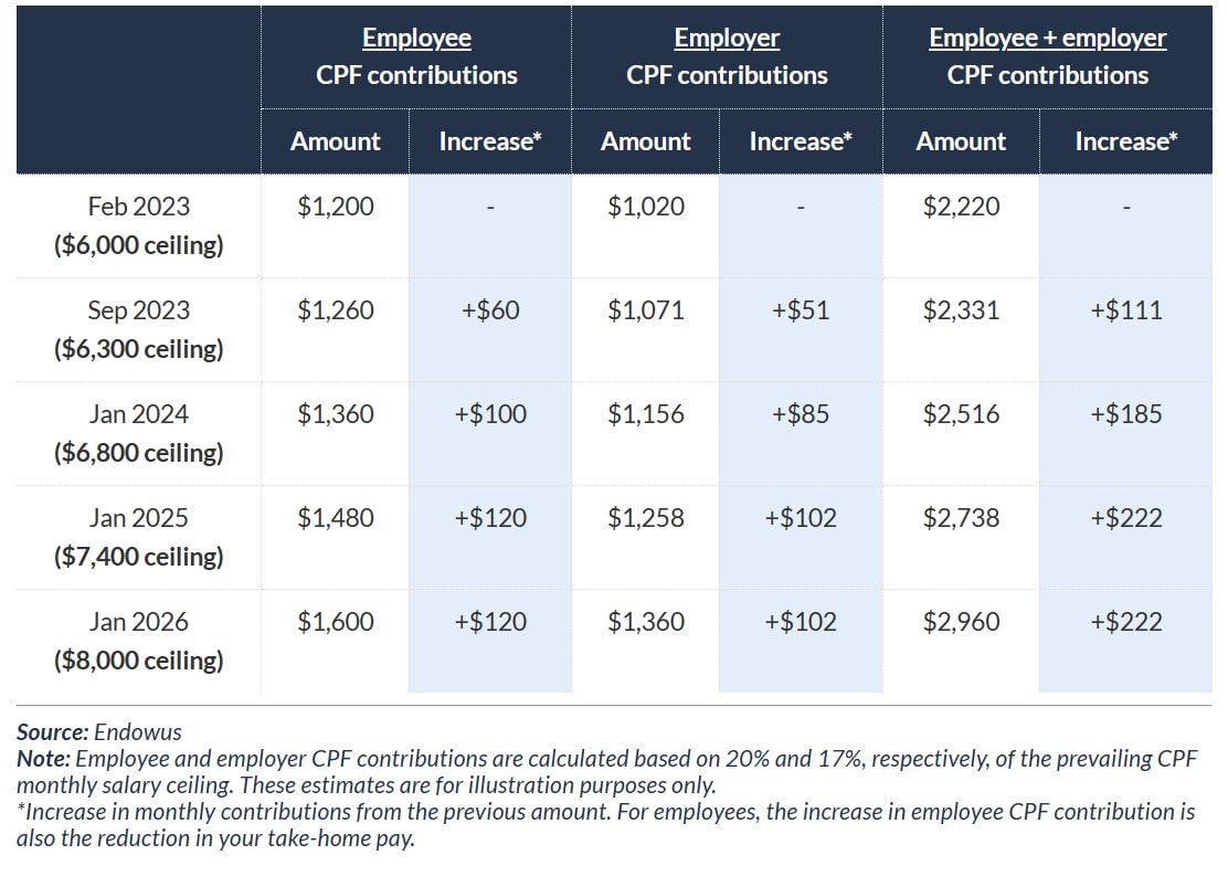 Let’s say a 25-year-old in 2022 earned a monthly salary of S$6,000. This salary then goes up on a staggered basis over four phases, starting from September 2023, to S$8,000 by January 2026 - exactly mirroring how the increases in the CPF monthly salary ceiling will be staggered through to 2026.