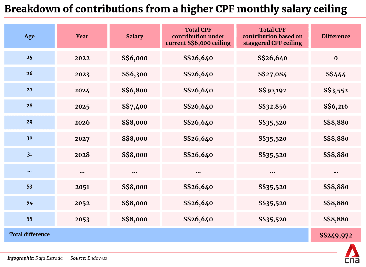 By the time this person turns 55, nearly S$250,000 more in contributions would have gone into his or her CPF than if the ceiling had stayed at S$6,000. This figure excludes interest and assumes the S$8,000 ceiling is unchanged from 2026 to 2053.