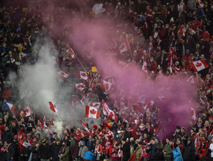 Canada's fans cheer as they take on Costa Rica during first half of a FIFA World Cup qualifying soccer game in Edmonton, Alberta, Friday, Nov. 12, 2021. (Jason Franson/The Canadian Press via AP)