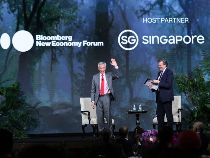 Prime Minister Lee Hsien Loong (left) at a fireside chat with Bloomberg editor-in-chief John Micklethwait at the Bloomberg New Economy Forum on Nov 17, 2021. (Photo: MCI)