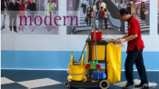 A cleaner mopping up Bukit Timah Plaza after rain seeped into the building on Aug 24, 2021. (Photo: Jeremy Long)