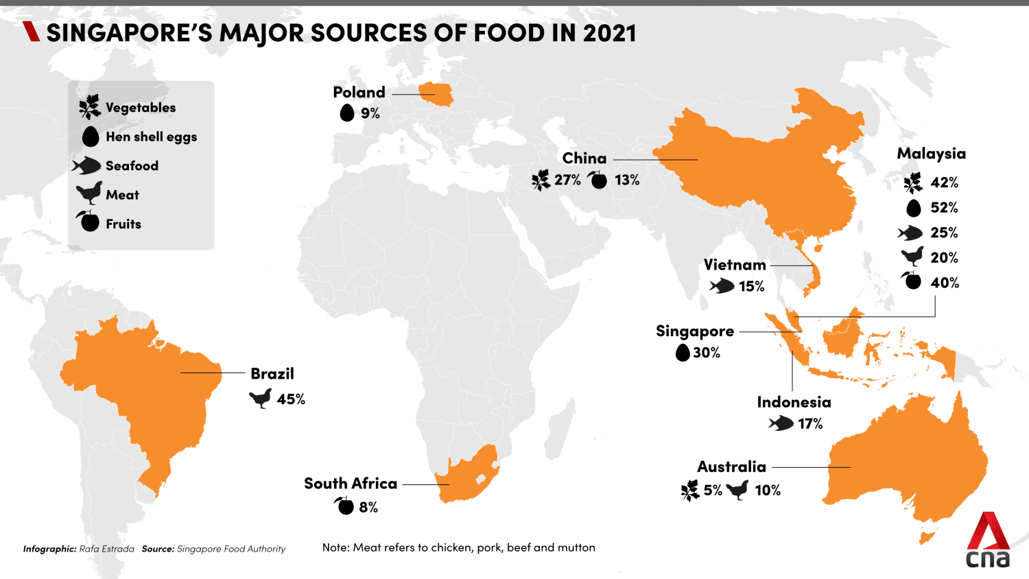 While Singapore has increased its efforts to diversify its food sources across more countries (180 countries in 2021), a large proportion of each food item imported is still largely concentrated among a few countries, especially our neighbours Malaysia and Indonesia.