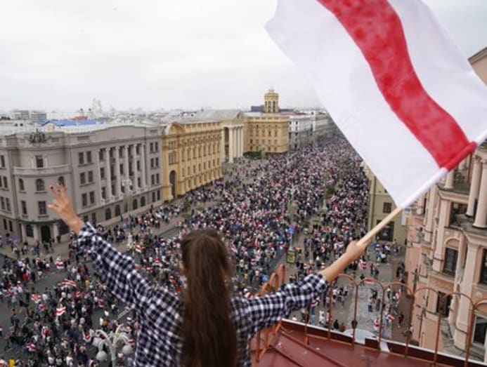 A woman, standing on the roof of a building, waves a Belarusian national flag standing on the roof as Belarusian opposition supporters march to Independence Square in Minsk. Massive pro-democracy protests against President Lukashenko's iron-fist rule have left Putin deeply concerned about open democracies flourishing at Russia's doorstep. (AP Photo/Evgeniy Maloletka, File)