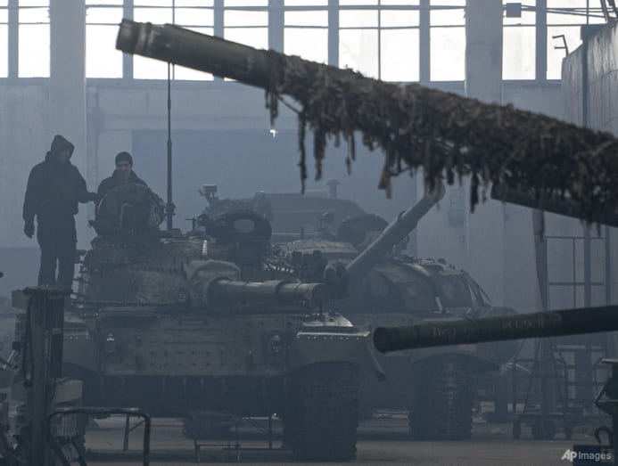 Workers stand atop a tank T-64 on Repair Tank Factory in Kharkiv. Ukraine's second-largest city is one of its industrial centres and includes two factories that restore old Soviet-era tanks or build new ones. (AP Photo/Evgeniy Maloletka)
