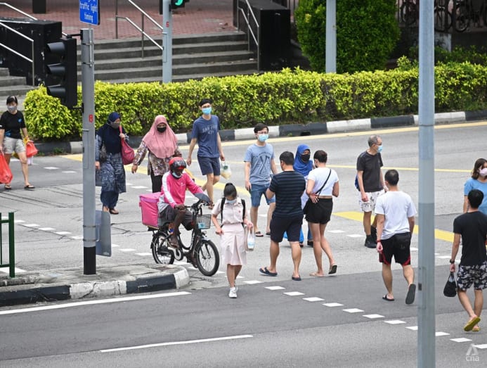 People wearing face masks cross the road in Tampines in Singapore on Feb 25, 2022. (Photo: CNA/Gaya Chandramohan)