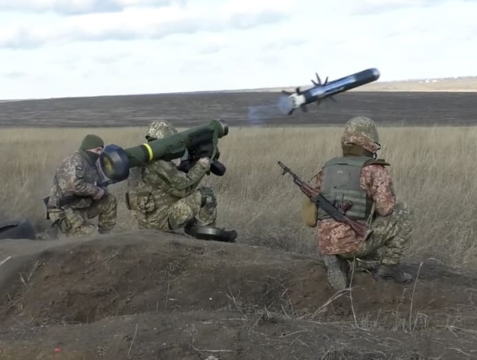 Ukrainian soldiers use a launcher with US Javelin missiles during military exercises in Donetsk region, Ukraine, Wednesday, Jan. 12, 2022. (Ukrainian Defense Ministry Press Service via AP, File)