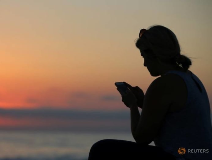 A woman looks at her mobile phone as the sun sets over the ocean in Encinitas, California, U.S., July 5, 2017. REUTERS/Mike Blake