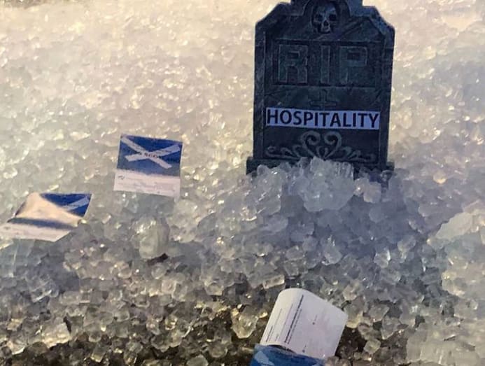 Hospitality workers dump buckets of ice onto the streets of Glasgow to protest a new wave of COVID restrictions that threaten the survival of their businesses. (Douglas Barrie/PA via AP)