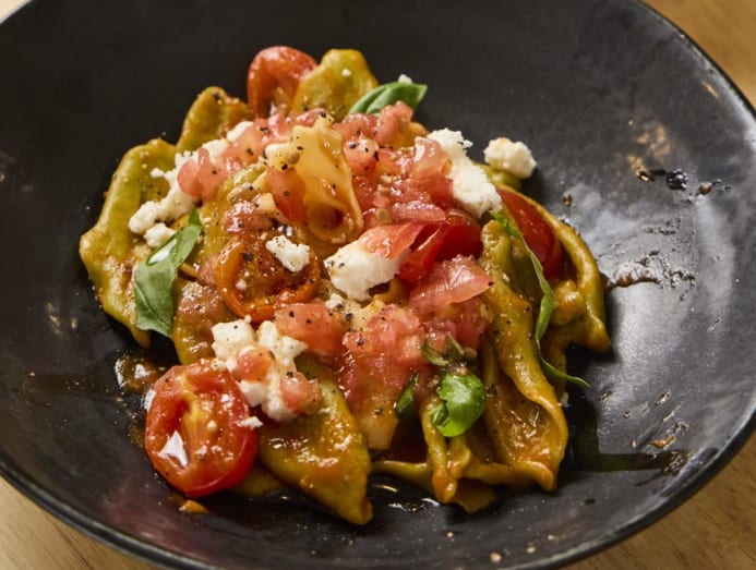 Instead of a heavy, herb-laden red sauce, the pasta is deliberately dressed in a lighter style to let the handmade dough shine – just a sauce made from sauteed and raw tomatoes, fresh basil, crumbles of feta, and black pepper. Made from semolina dough, the pasta has a satisfying chew and a faintly nutty flavour. The result is bright, fresh, and quietly charming, letting the gentle flavour and texture of the pasta take centre stage.