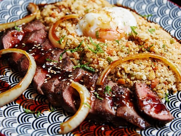 Avid gym rat Adam confesses that he wanted a diet-friendly dish to order at his own cafe, which is why he also offers cauliflower rice (which is basically cauliflower florets blitzed into grain-sized bits). This is paired with a slab of Australian rib eye steak, an onsen egg, caramelised onions and teriyaki dressing. Not exactly clean eating, but reasonably tasty and filling.