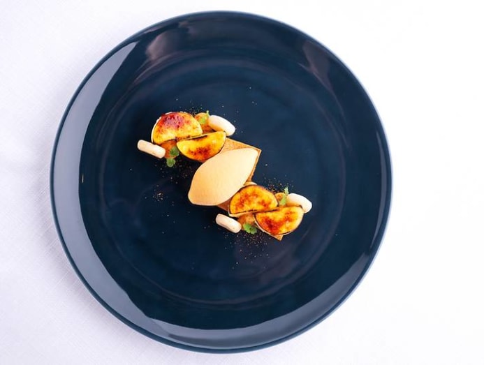 She then integrated the jam into a dessert with camellia oil sable, pineapple sorbet, and rum and raisin curd.