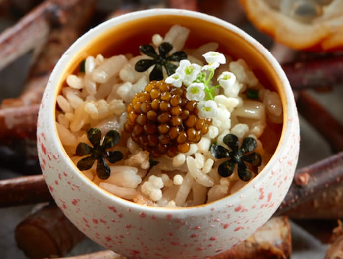 Here, however, it’s gotten a cosmopolitan upgrade: The rice is cooked with kombu and rice wine vinegar, sushi-style. There’s also some granadilla, a South American fruit from the passionfruit family, in the bottom of the dish, to lend a hint of sweetness and acidity. Growing up, “My mum would put one in my lunch every day.”