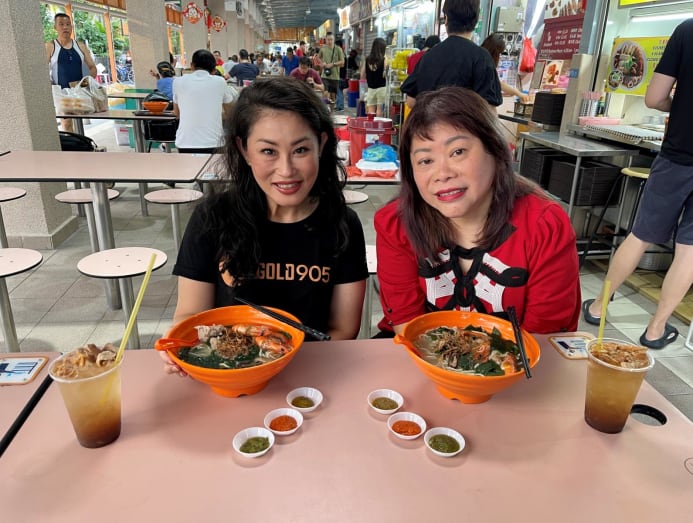 Mediacorp Gold 905 DJ Denise Tan with private hire driver Alice Kee having China Whampoa Home Made Noodles’ handmade noodles at Whampoa Makan Place. (Photo: Denise Tan)